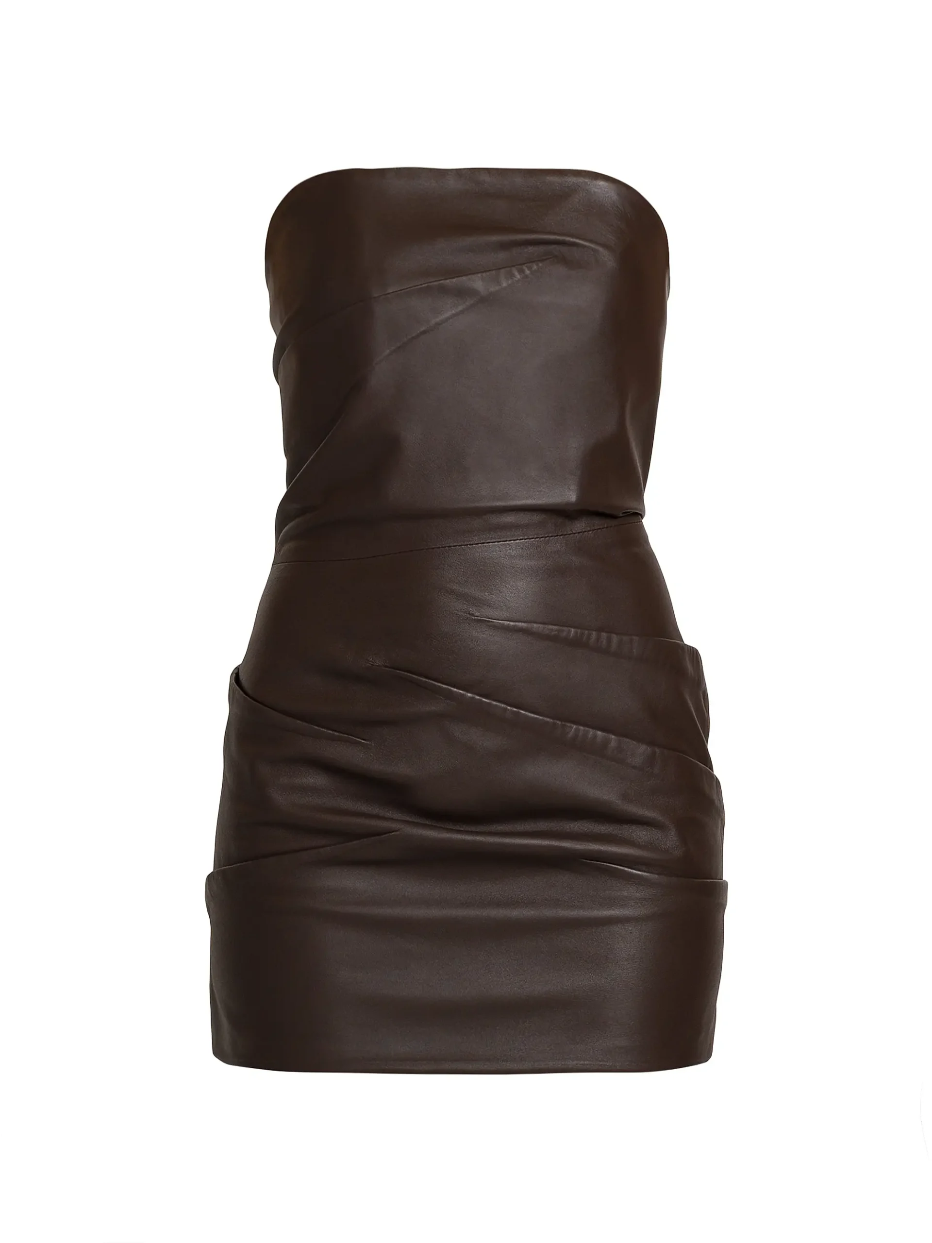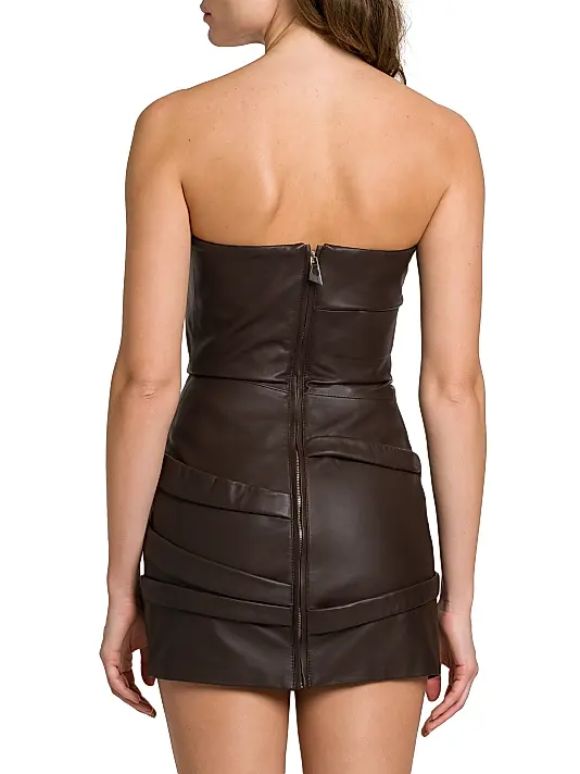 Crafted from high-quality vegan leather in a rich dark brown/espresso hue, the dress offers a structured yet supple feel. It features a chic strapless neckline and a tailored mini length. The most defining feature is the intricate asymmetrical ruching and pleating that wraps diagonally across the entire bodice and skirt, creating dimension, highlighting the curves, and providing an instantly captivating texture.