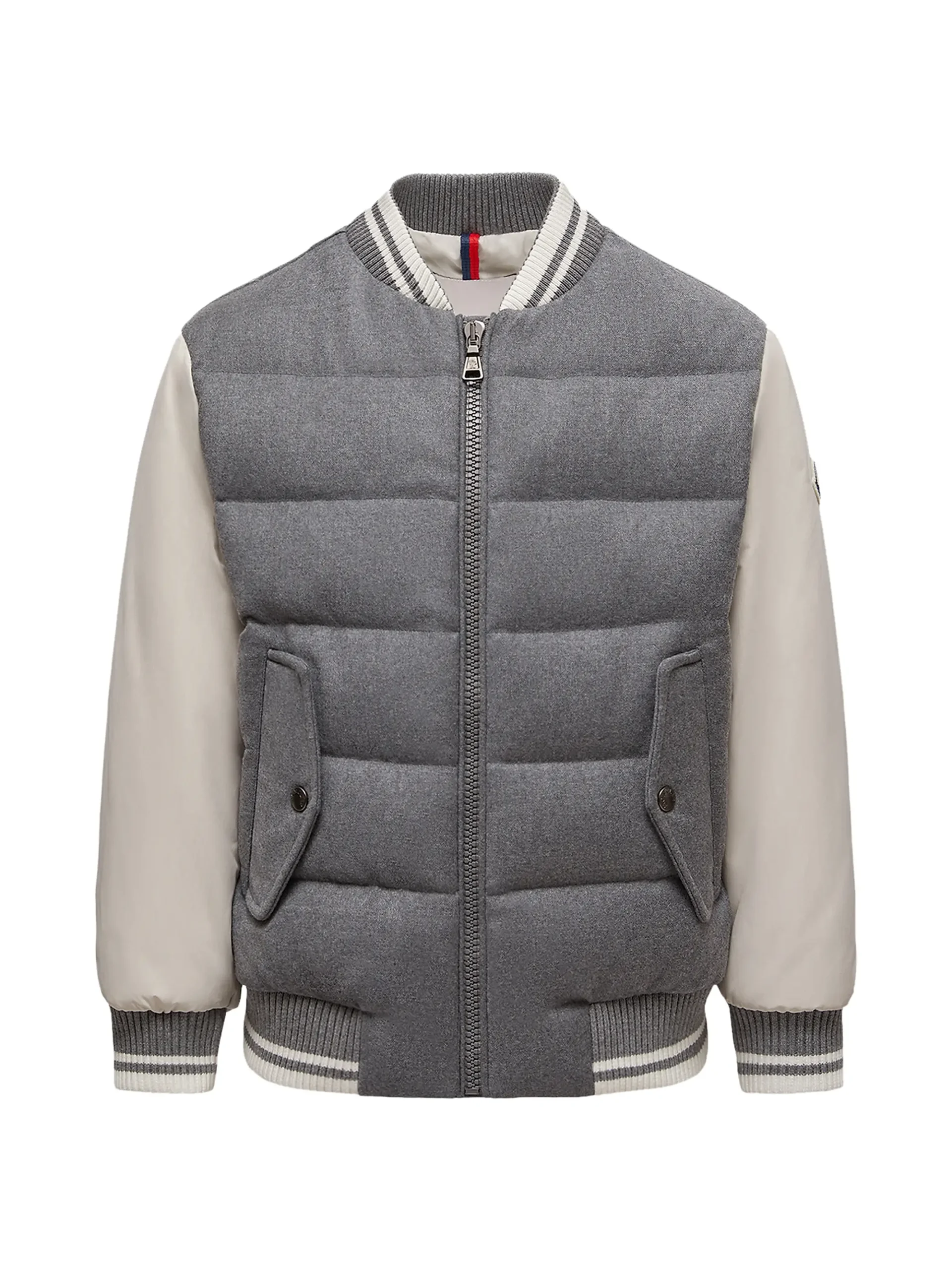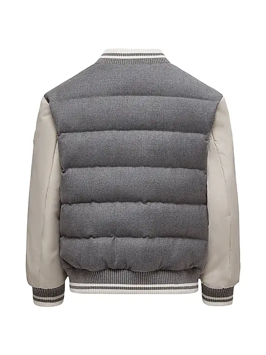 The body of the jacket is crafted from a high-quality grey wool or wool-blend fabric that is horizontally quilted and lightly padded, offering excellent insulation without bulk. The sleeves are a contrasting cream/light beige padded nylon or leather/faux leather, creating the iconic two-tone look of a traditional varsity jacket.