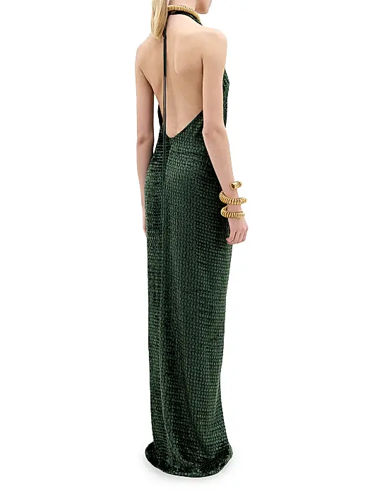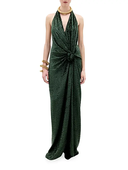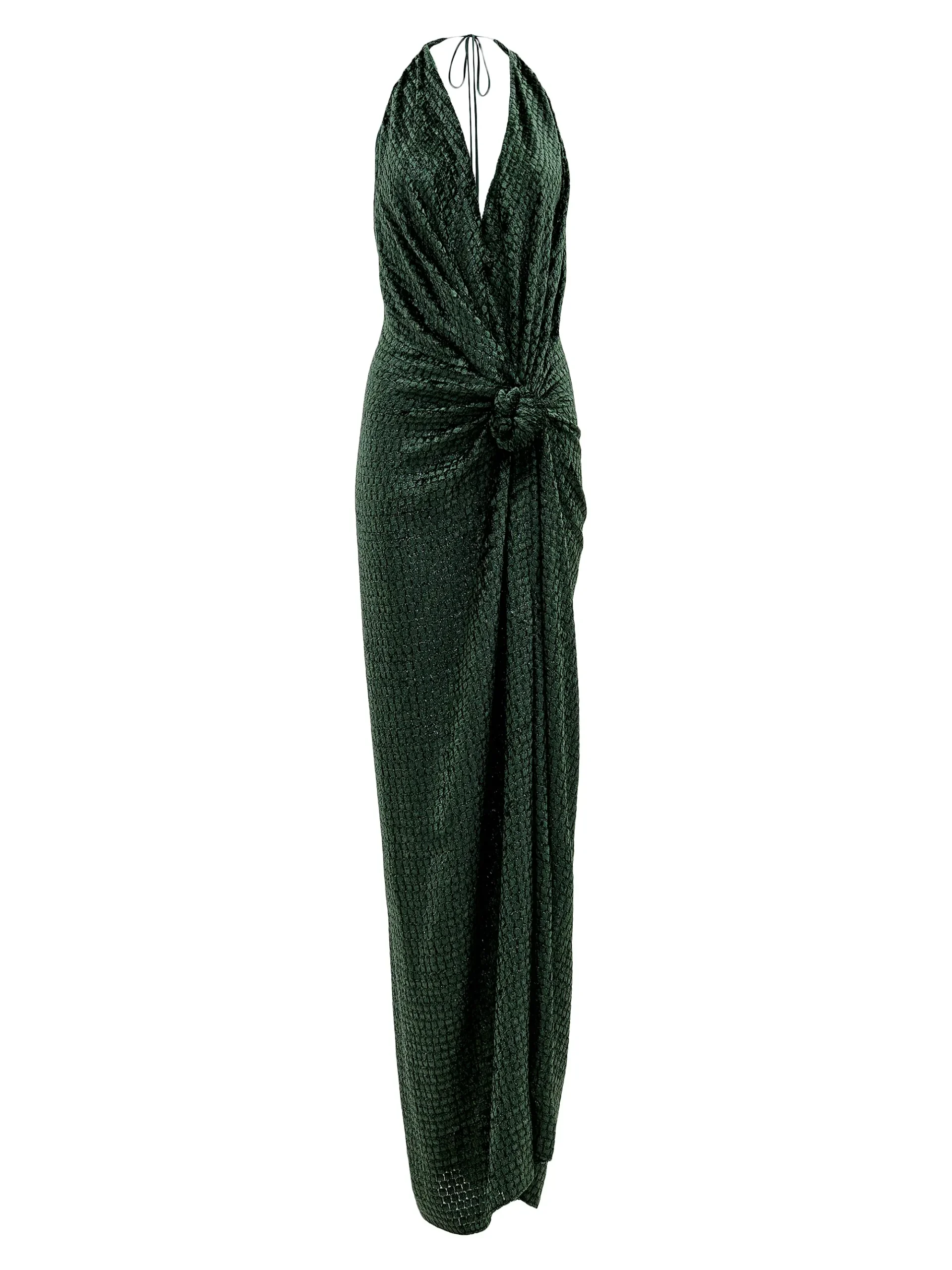Step into the spotlight with the Emerald Knot Halter Gown, a dress that perfectly blends sophisticated design with striking texture. This stunning maxi gown is rendered in a deep, rich forest green, giving it an immediately luxurious and elegant feel.