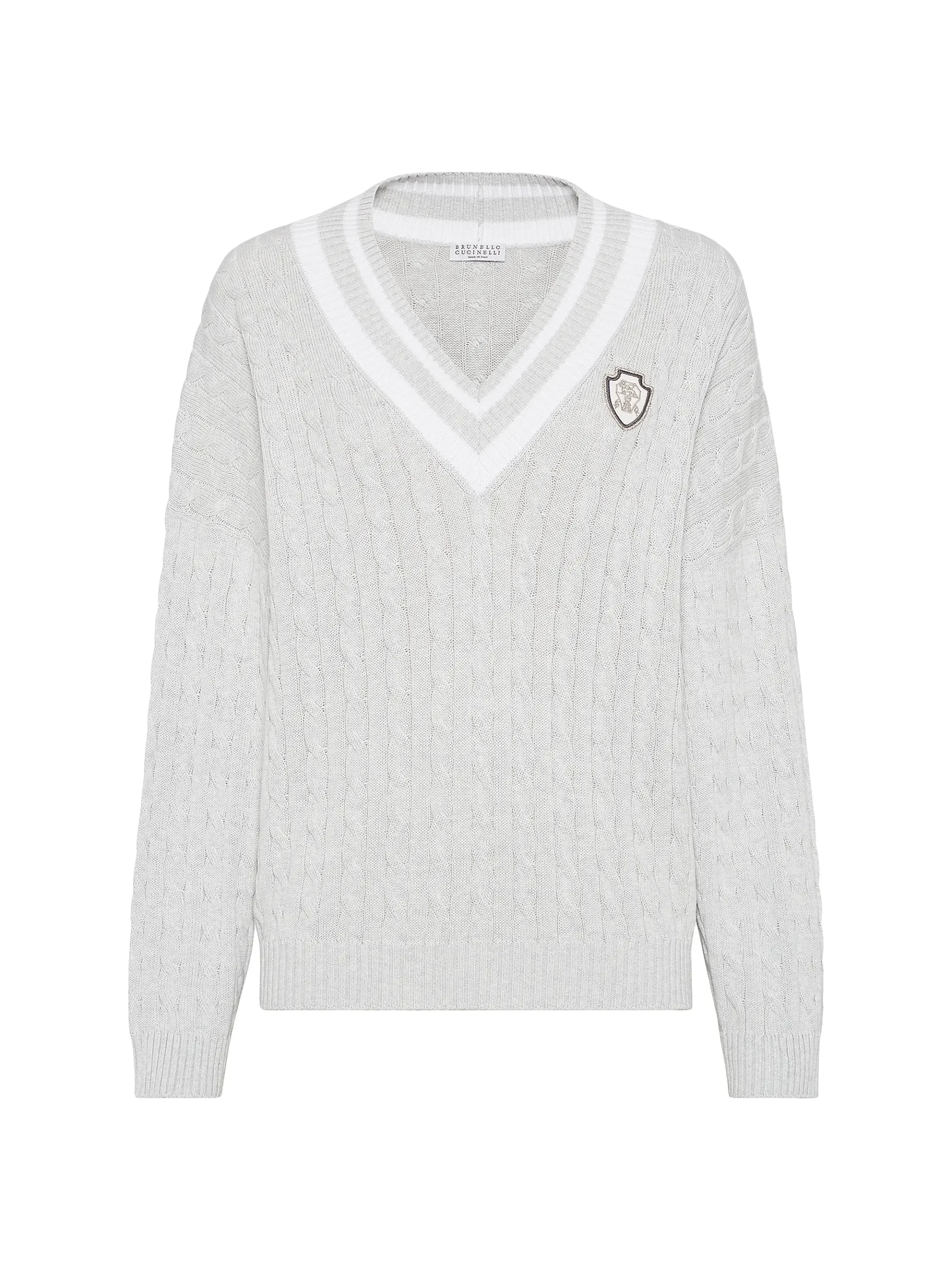 Details: Cable-knit body, contrast tipped V-neck, embroidered chest crest/patch.