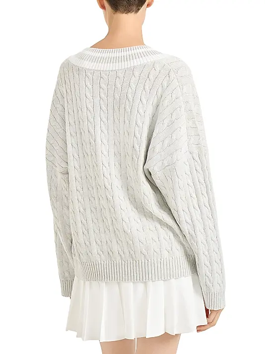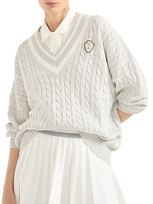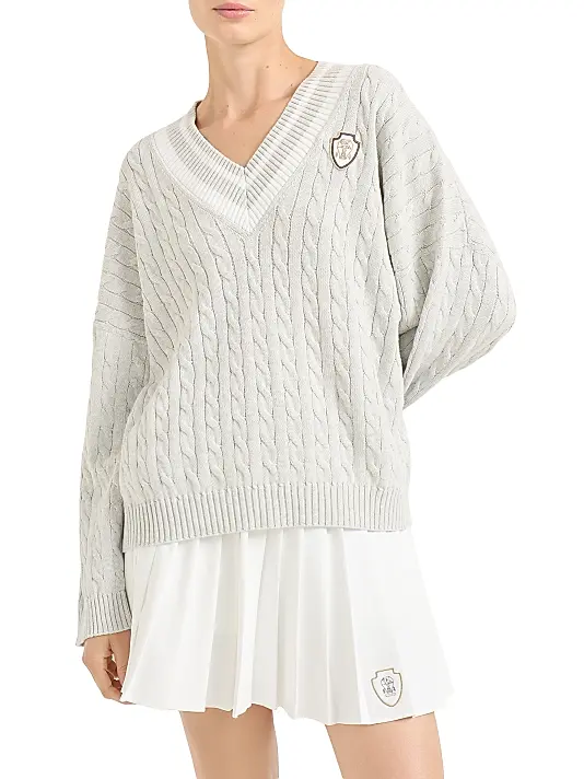 Embrace timeless elegance with this luxurious, varsity-inspired sweater. Crafted from a soft blend of high-quality yarns , this piece features a traditional all-over cable knit texture that adds depth and classic appeal. The signature detail is the deep V-neckline, accented with crisp, contrasting white and grey tipping—a nod to classic cricket or tennis wear. A subtle, embroidered collegiate-style crest or shield patch is placed neatly on the chest, lending a sophisticated, heritage feel. With its relaxed fit and ribbed cuffs, this light grey or cream sweater is perfect for layering over a crisp shirt or wearing solo for a refined, preppy look.