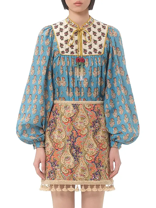 Capture effortless bohemian chic with this stunning peasant blouse, crafted from a lightweight fabric in a vibrant cerulean blue. The body features a rich, all-over folkloric print, reminiscent of traditional block-printing techniques, punctuated by delicate vertical stripes. The generous, relaxed silhouette is enhanced by billowy, gathered sleeves that cinch softly at the cuffs. A defining feature is the contrasting bib and V-neckline, which is detailed with a complementary floral motif and outlined in a crisp yellow piping. The neckline is finished with charming drawstrings, complete with decorative floral accents and playful tassels, allowing for adjustable styling. Pair this relaxed-fit tunic with white denim, tailored shorts, or flowy linen trousers for an elegant resort or weekend look.