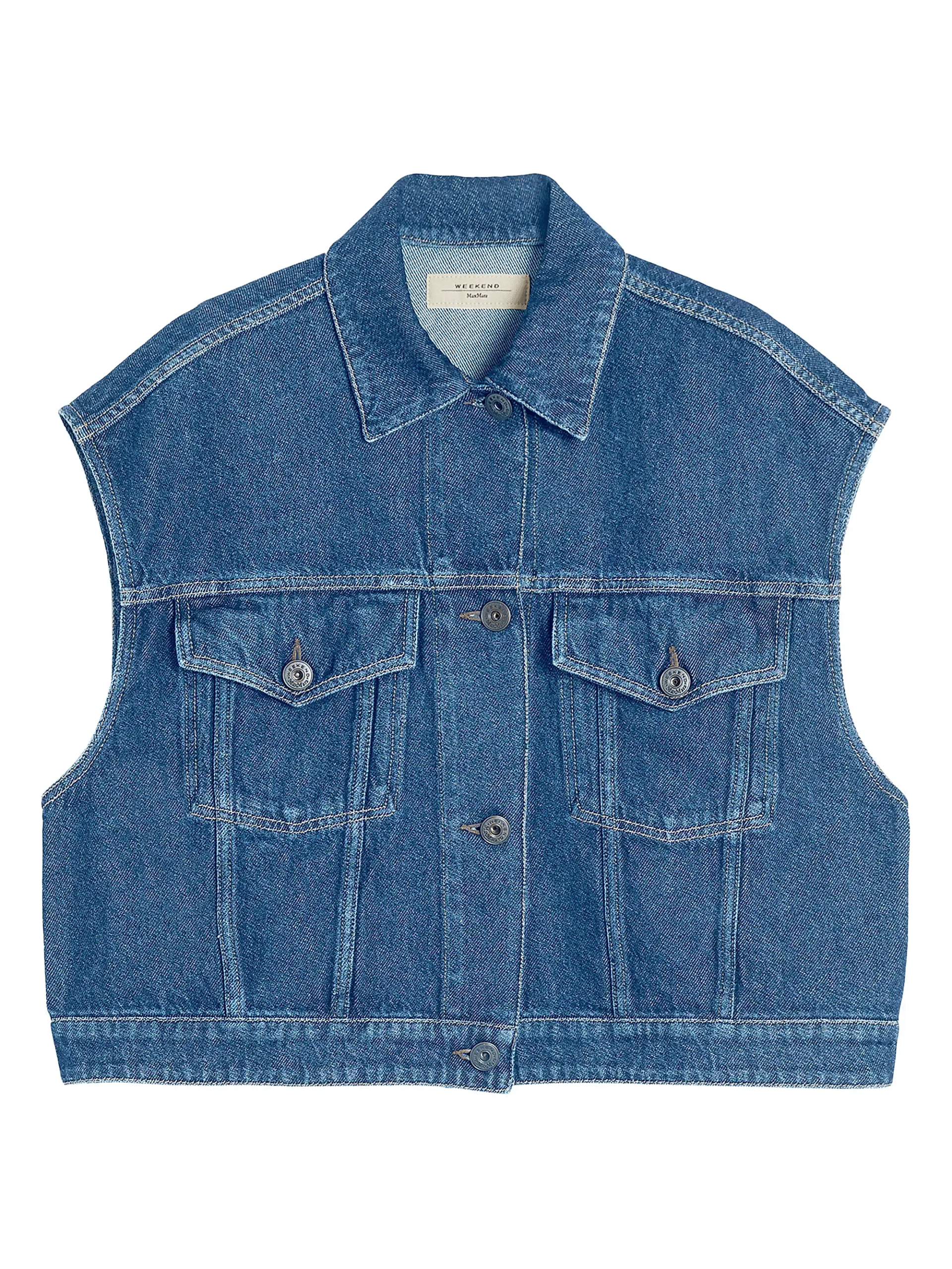This is a cropped, sleeveless denim vest in a medium-to-dark blue wash. It features classic denim jacket styling elements, including a traditional pointed collar and a button-front closure. The garment has two flap chest pockets, both secured with buttons, adding a utilitarian touch. The fit appears slightly relaxed or boxy, with wide shoulder lines that give it a structured, modern silhouette. The fabric has visible texture and contrast stitching, typical of denim. The internal neck label is visible, indicating the Weekend Max Mara brand, suggesting a quality, high-fashion piece. This vest is ideal for layering over dresses, t-shirts, or sweaters to add a casual, rugged edge to any outfit.