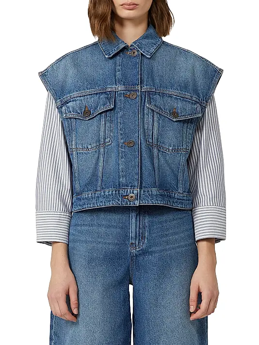 & Free ShippingWeekend Max Mara Cropped Denim Vest. A sleeveless, medium-wash denim vest featuring a classic collar, button front, and two flap chest pockets. Perfect for modern, versatile layering.
