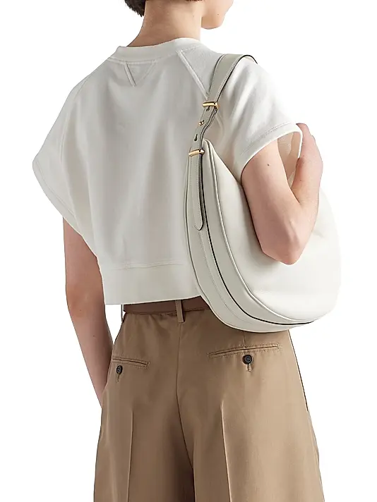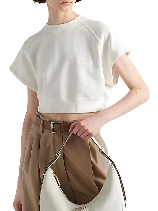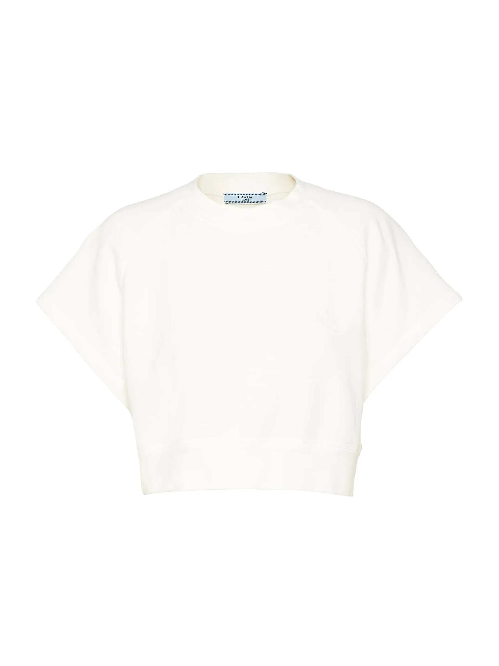 A minimalist and modern take on athletic wear. This cropped sweatshirt is crafted from a soft, comfortable white or ivory fleece/sweatshirt material. It features a relaxed, boxy fit and a simple crewneck. The unique feature is the cap sleeve or wide dolman sleeve, which offers an architectural silhouette. Subtle branding includes an embossed or embroidered designer logo on the chest. The wide ribbed hem completes the cropped cut, making it ideal for pairing with high-waisted trousers or skirts.